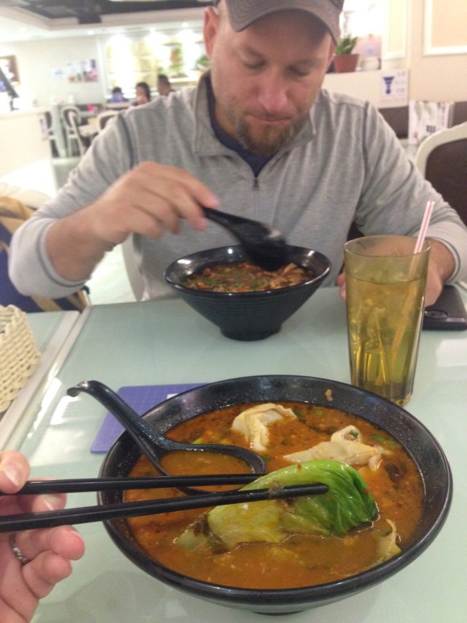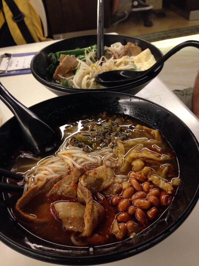 You eat the dish by gradually adding the noodles and greens to the broth, as the broth goes down. I wish I could send flavors! In the States I usually do not prefer vinegar based dishes and sauces (for example, I prefer sweet barbeque sauce to a vinegar one), but here, the mix of herbs and, well, probably the sugar they add, makes it taste more like a fresh salad – a fresh noodle salad. Since you eat the dish with chopsticks and a spoon, you usually end up eating the noodles/greens/meat first, and sipping the leftover broth at the end.