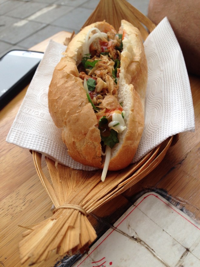 Banh Mi – Vietnamese Sandwich. It comes in a variety of meats and has a collection of different vegetables (often pickled) and herbs – they are more delicious than your average sandwich and cost around 15k ( .70 cents US)