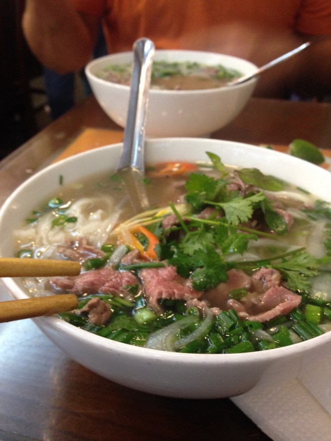And the ever famous – Pho, in this case, Pho Bo, Beef Pho. All phos are not created equal and I’ve found my favorite ones either have a light mix of ginger, cloves, and cinnamon or a heavy onion taste to the broth. There is also a stir fried version of this, everything seen here fried up in a pan, minus the broth. That too is tasty!
