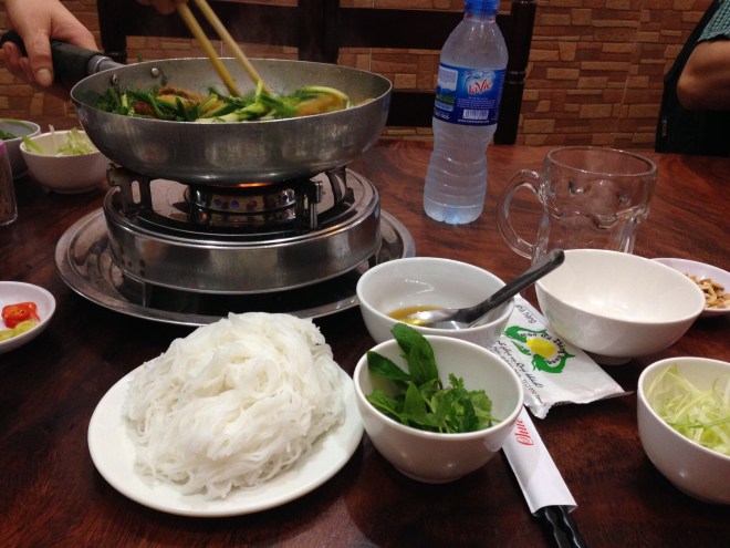 This is Cha Ca – Tumeric fish with fresh dill, lemon grass, and green onions that is served with rice noodles, fresh herbs, lime, and a light vinegary sauce. Strangely, the dill had very little flavor at the place we had it, but it was still pretty tasty.
