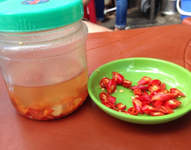 Bun Cha is essentially a pork noodle bowl that is served with fresh herbs and greens. Upon ordering the cook brings a small bowl filled with a hot, sweet and savory, sometimes garlic-y, vinegar broth with thin soaked slices of green papaya and carrot. Just before giving you the bowl they drop in a few strips of perfectly marinated, freshly grilled pork and a few small sweetly charred pork patties. On the side, you receive a plate of rice noodles and a bowl of lettuce and fresh herbs (mint, Vietnamese lemon mint, basil, sometimes cilantro, and some other types of herbs we haven’t yet figured out). There are also usually a set of “condiments” nearby – freshly chopped, quite hot peppers, a vinegary garlic sauce, soy sauce, fish sauce, sweet chili sauce. I usually just add the hot peppers and garlic 🙂